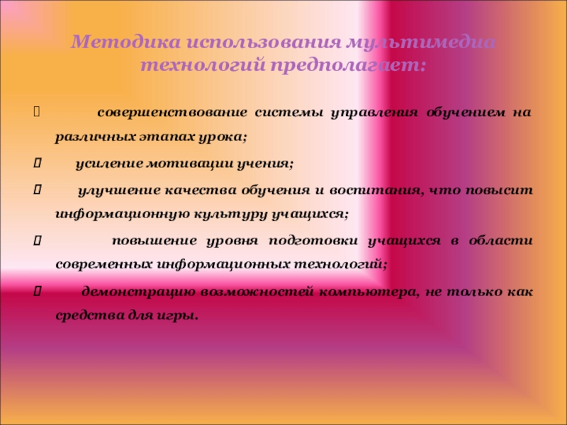 Слайд 5Методика использования мультимедиа технологий предполагает:
