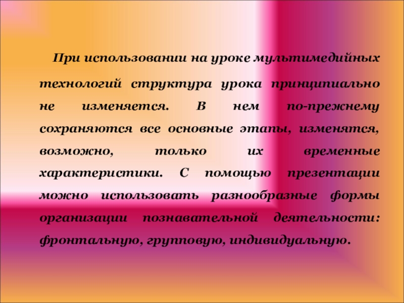 урока принципиально не изменяется. В нем по-прежнему сохраняются все основные этапы, изменятся, возможно, только их временные характеристики. С помощью презентации можно использовать разнообразные формы организации познавательной деятельности: фронтальную, групповую, индивидуальную.