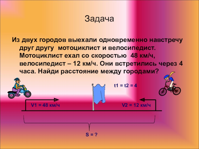 Мотоциклист ехал со скоростью 48 км/ч, велосипедист – 12 км/ч. Они встретились через 4 часа. Найди расстояние между городами?