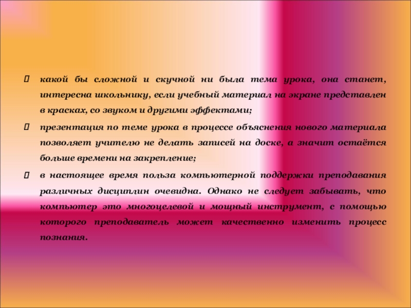 в настоящее время польза компьютерной поддержки преподавания различных дисциплин очевидна. Однако не следует забывать, что компьютер это многоцелевой и мощный инструмент, с помощью которого преподаватель может качественно изменить процесс познания.