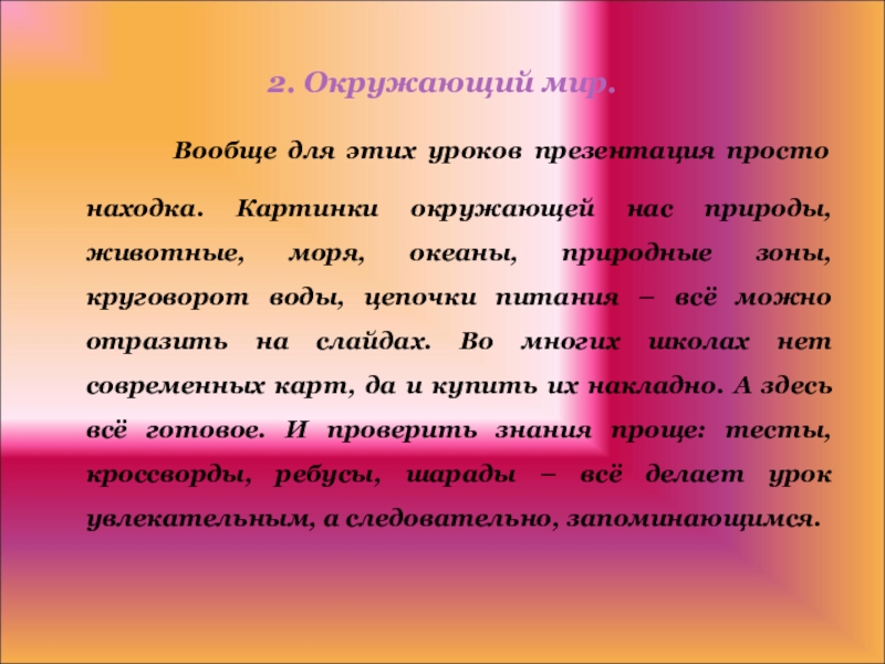 просто находка. Картинки окружающей нас природы, животные, моря, океаны, природные зоны, круговорот воды, цепочки питания – всё можно отразить на слайдах. Во многих школах нет современных карт, да и купить их накладно. А здесь всё готовое. И проверить знания проще: тесты, кроссворды, ребусы, шарады – всё делает урок увлекательным, а следовательно, запоминающимся.