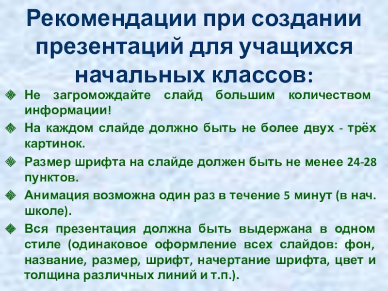 Рекомендации при создании презентаций для учащихся начальных классов:
