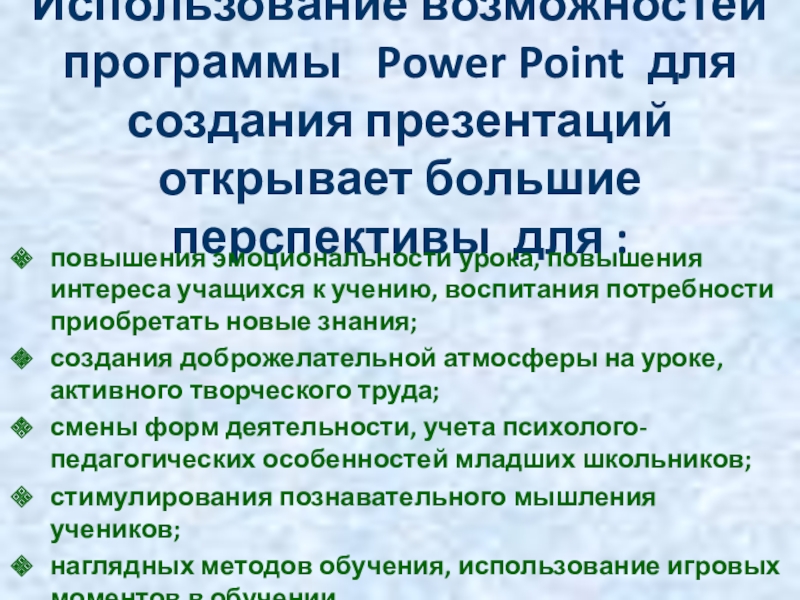 Использование возможностей программы Power Point для создания презентаций открывает большие