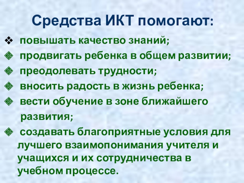 2. достижению целей обучения с помощью современных электронных учебных материалов, предназначенных для использования на уроках в начальной школе;
