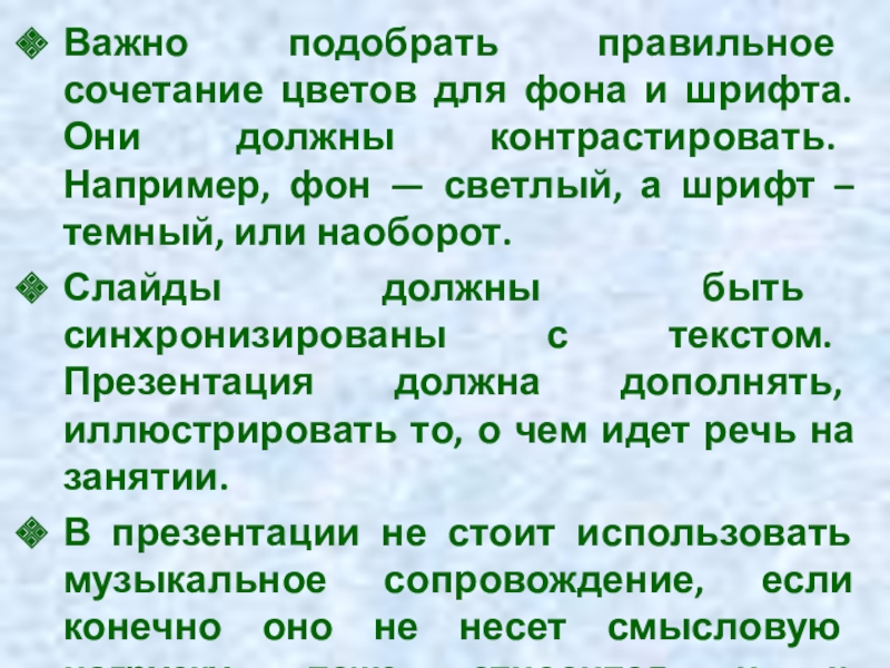 Слайды должны быть синхронизированы с текстом. Презентация должна дополнять, иллюстрировать то, о чем идет речь на занятии.