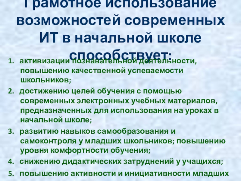 Грамотное использование возможностей современных ИТ в начальной школе способствует: