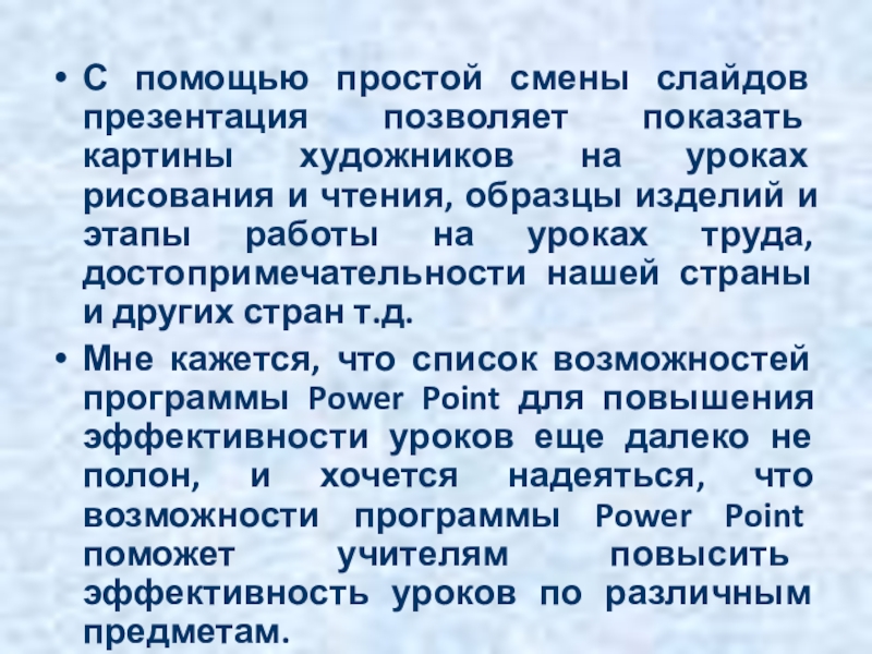 Мне кажется, что список возможностей программы Power Point для повышения эффективности уроков еще далеко не полон, и хочется надеяться, что возможности программы Power Point поможет учителям повысить эффективность уроков по различным предметам.