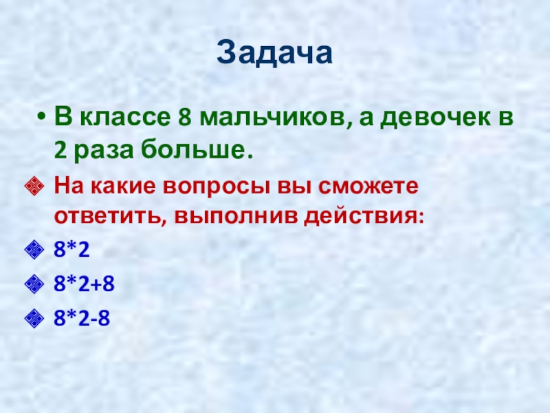 В классе 8 мальчиков, а девочек в 2 раза больше.