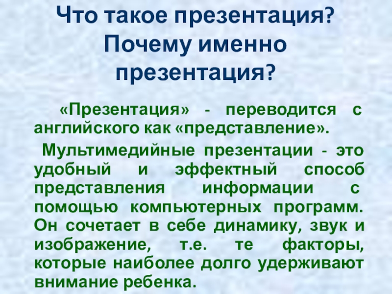 Мультимедийные презентации - это удобный и эффектный способ представления информации с помощью компьютерных программ. Он сочетает в себе динамику, звук и изображение, т.е. те факторы, которые наиболее долго удерживают внимание ребенка.