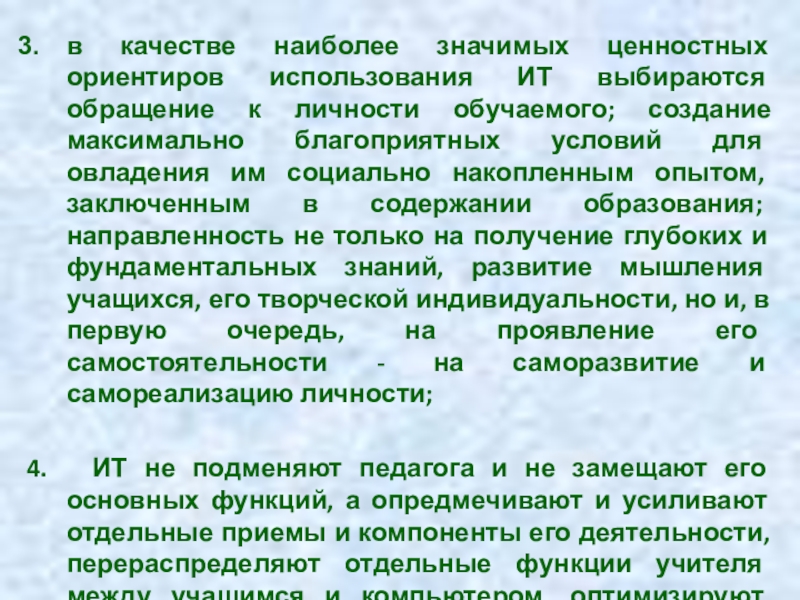 Слайд 4в качестве наиболее значимых ценностных ориентиров использования ИТ выбираются обращение к
