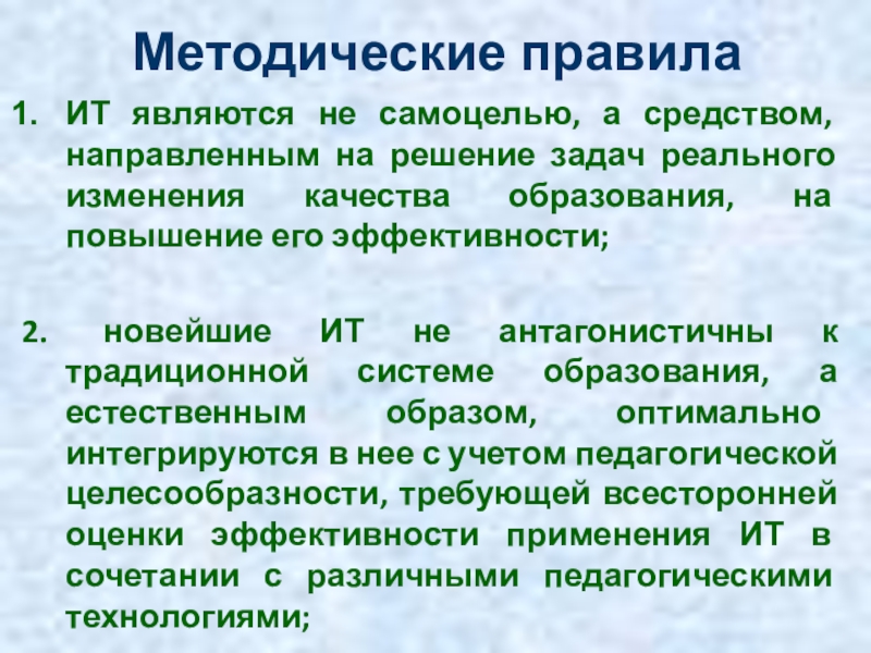 2. новейшие ИТ не антагонистичны к традиционной системе образования, а естественным образом, оптимально интегрируются в нее с учетом педагогической целесообразности, требующей всесторонней оценки эффективности применения ИТ в сочетании с различными педагогическими технологиями;