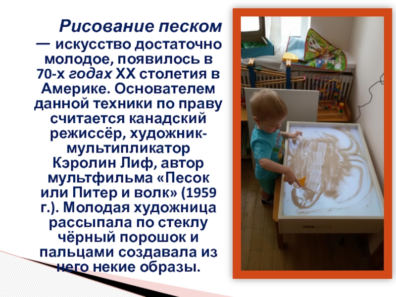 Слайд 2 Рисование песком — искусство достаточно молодое, появилось в 70-х годах ХХ