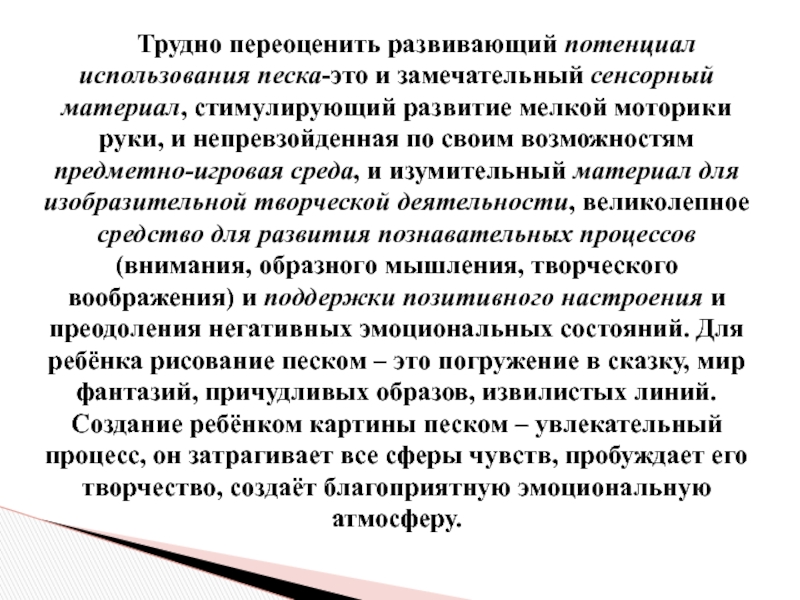 Слайд 4Трудно переоценить развивающий потенциал использования песка-это и замечательный сенсорный материал, стимулирующий