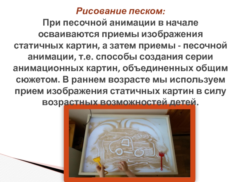 а затем приемы - песочной анимации, т.е. способы создания серии анимационных картин, объединенных общим сюжетом. В раннем возрасте мы используем прием изображения статичных картин в силу возрастных возможностей детей.