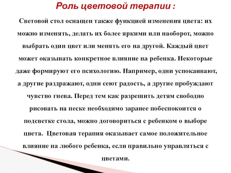 можно изменять, делать их более яркими или наоборот, можно выбрать один цвет или менять его на другой. Каждый цвет может оказывать конкретное влияние на ребенка. Некоторые даже формируют его психологию. Например, одни успокаивают, а другие раздражают, одни сеют радость, а другие пробуждают чувство гнева. Перед тем как разрешить детям свободно рисовать на песке необходимо заранее побеспокоится о подсветке стола, можно договориться с ребенком о выборе цвета. Цветовая терапия оказывает самое положительное влияние на любого ребенка, если правильно управляться с цветами.