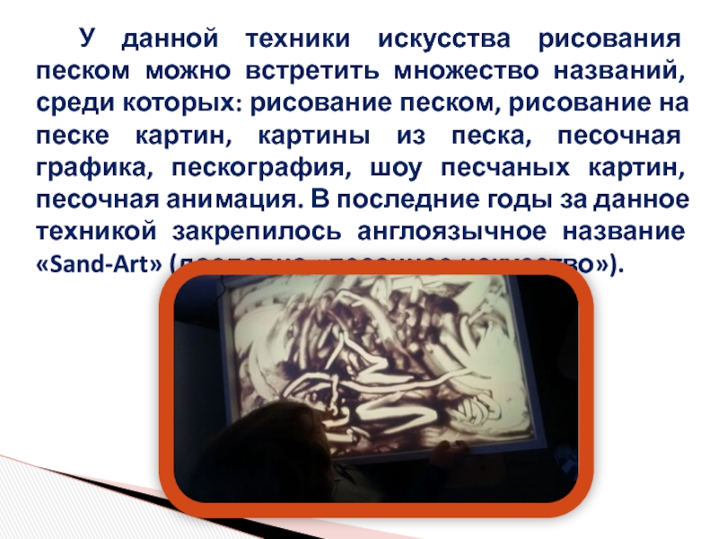 Слайд 3 У данной техники искусства рисования песком можно встретить множество