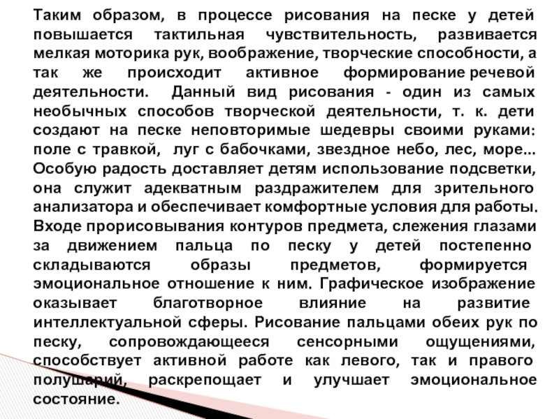 развитие мелкой моторики руки, и непревзойденная по своим возможностям предметно-игровая среда, и изумительный материал для изобразительной творческой деятельности, великолепное средство для развития познавательных процессов (внимания, образного мышления, творческого воображения) и поддержки позитивного настроения и преодоления негативных эмоциональных состояний. Для ребёнка рисование песком – это погружение в сказку, мир фантазий, причудливых образов, извилистых линий. Создание ребёнком картины песком – увлекательный процесс, он затрагивает все сферы чувств, пробуждает его творчество, создаёт благоприятную эмоциональную атмосферу.