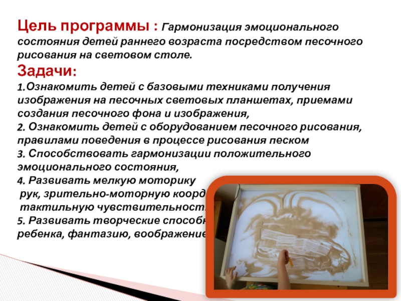 Цель программы : Гармонизация эмоционального состояния детей раннего возраста посредством песочного