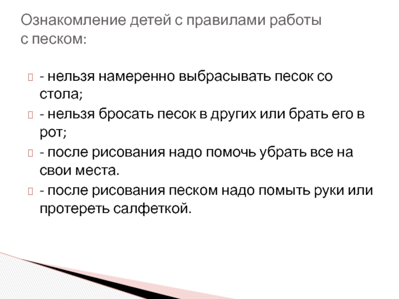 Слайд 10- нельзя намеренно выбрасывать песок со стола;