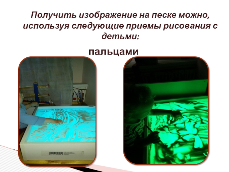 Слайд 12Получить изображение на песке можно, используя следующие приемы рисования с детьми: