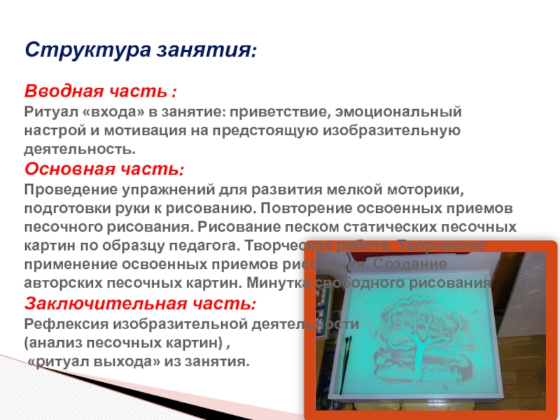 Проведение упражнений для развития мелкой моторики, подготовки руки к рисованию. Повторение освоенных приемов песочного рисования. Рисование песком статических песочных картин по образцу педагога. Творческая работа. Творческое применение освоенных приемов рисования. Создание авторских песочных картин. Минутка свободного рисования