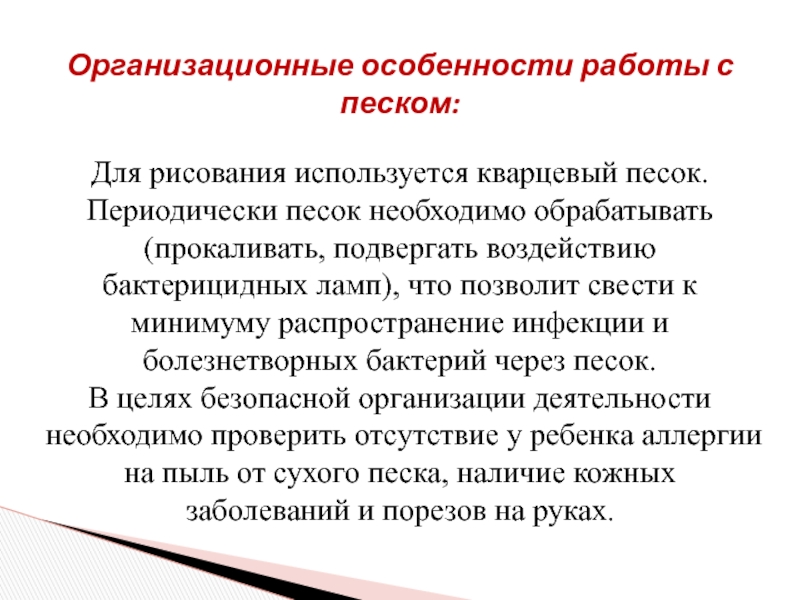 Слайд 6Организационные особенности работы с песком: