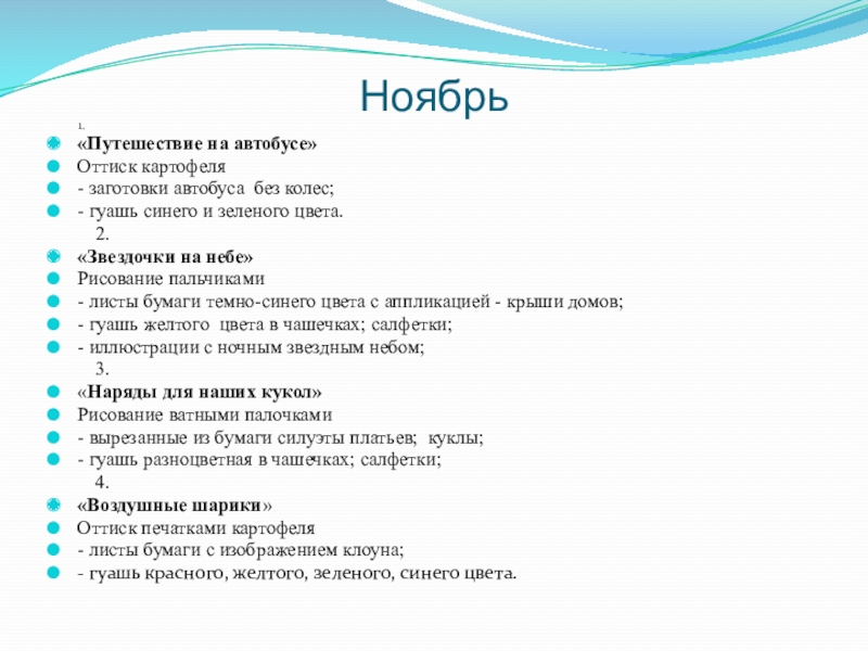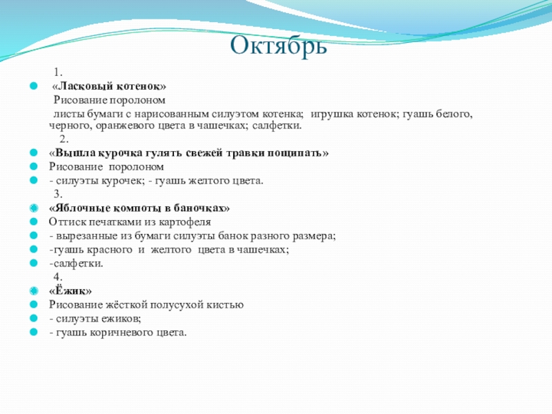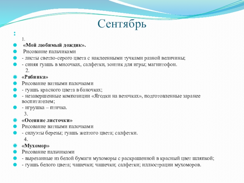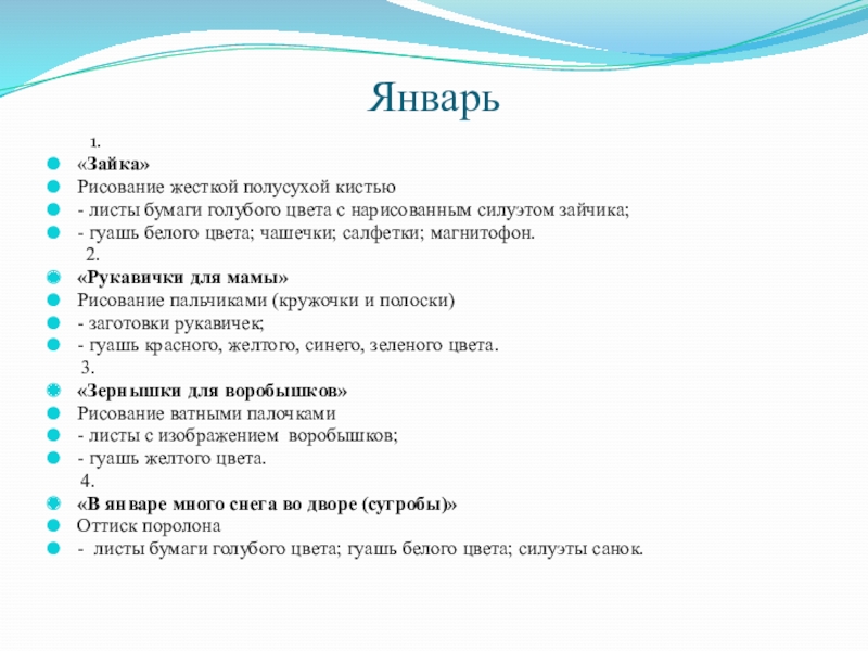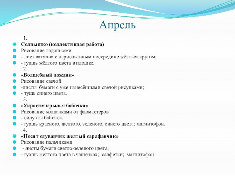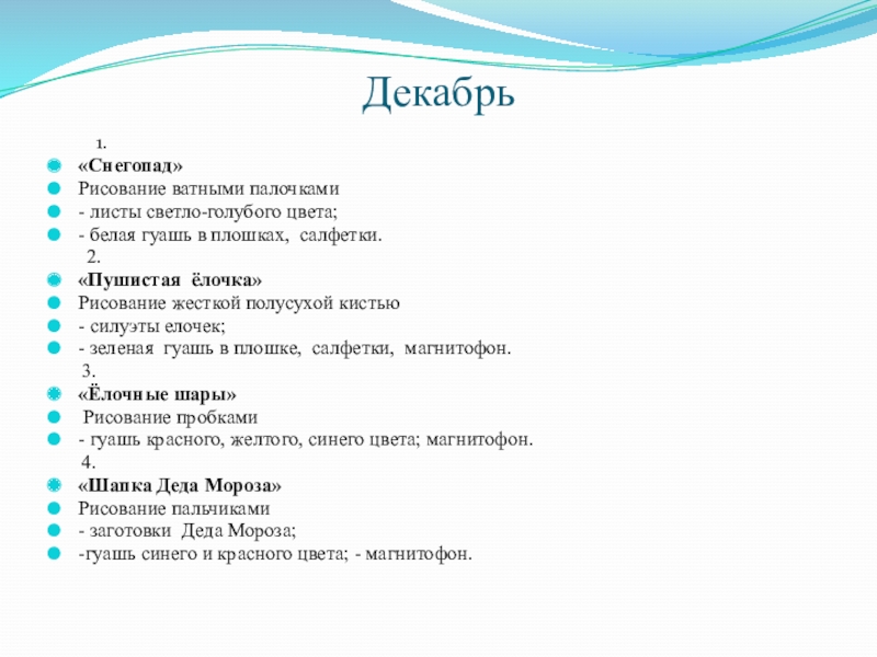 - гуашь белого цвета; чашечки; салфетки; магнитофон.