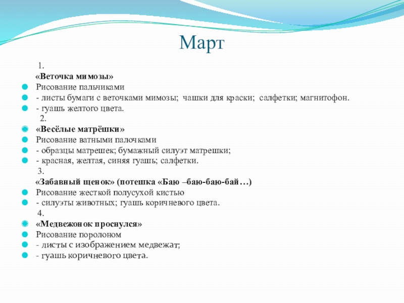 с веточками мимозы; чашки для краски; салфетки; магнитофон.