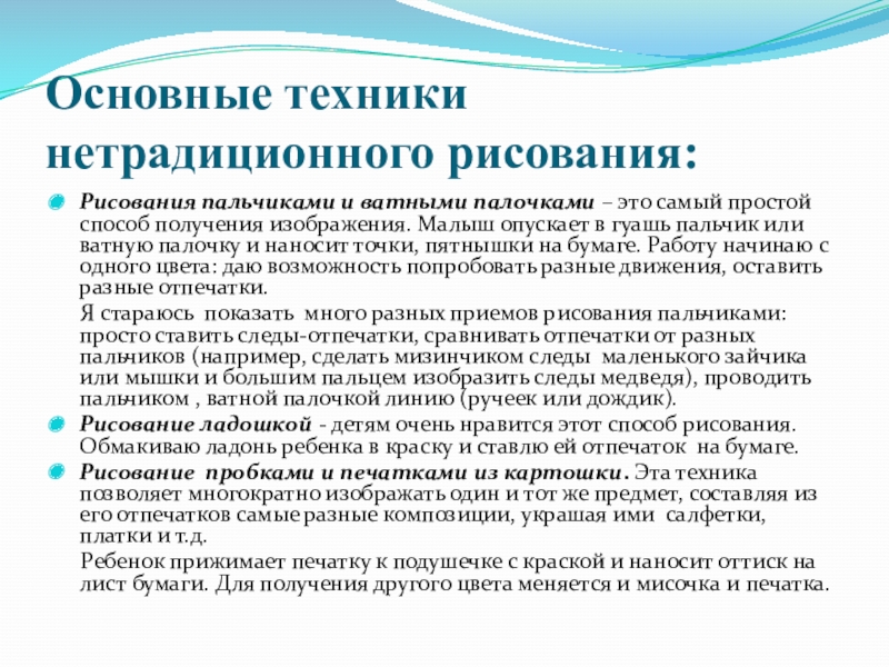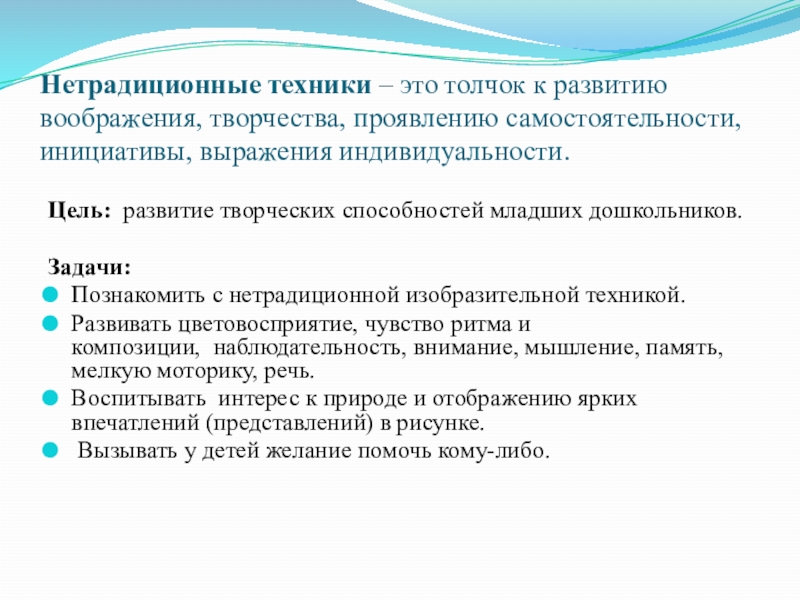 Слайд 3Нетрадиционные техники – это толчок к развитию воображения, творчества, проявлению самостоятельности, инициативы,