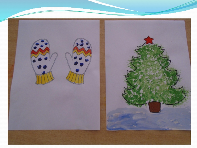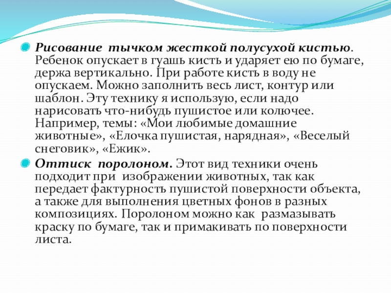 ударяет ею по бумаге, держа вертикально. При работе кисть в воду не опускаем. Можно заполнить весь лист, контур или шаблон. Эту технику я использую, если надо нарисовать что-нибудь пушистое или колючее. Например, темы: «Мои любимые домашние животные», «Елочка пушистая, нарядная», «Веселый снеговик», «Ежик».