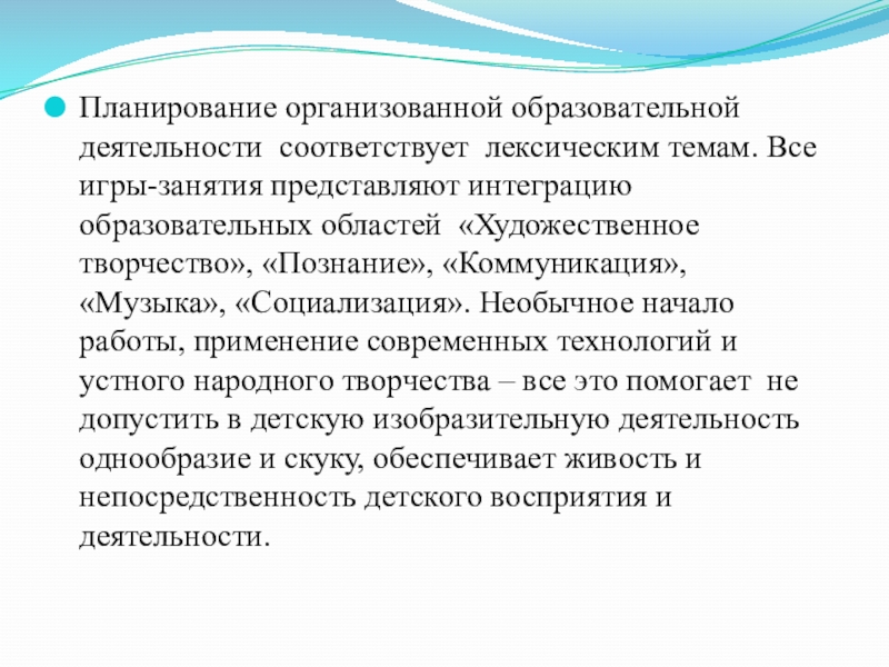 Слайд 6Планирование организованной образовательной деятельности соответствует лексическим темам. Все игры-занятия представляют интеграцию