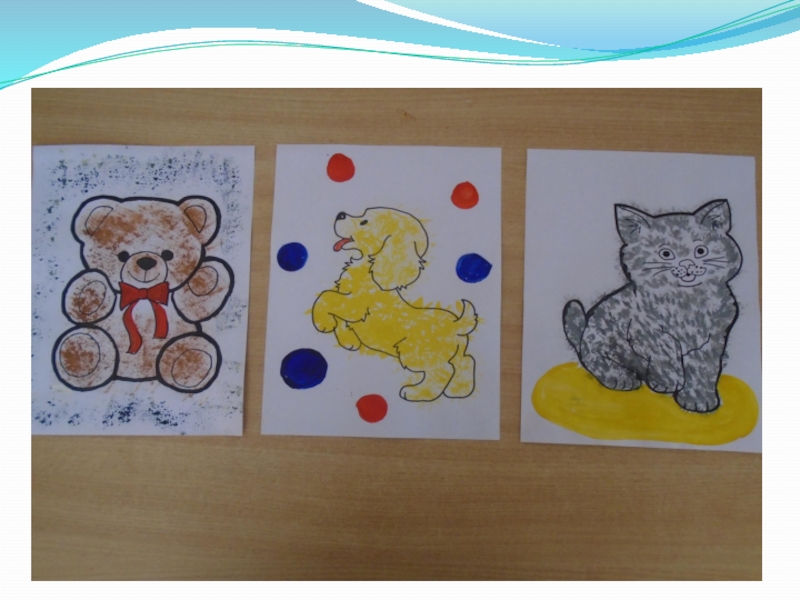 Оттиск поролоном. Этот вид техники очень подходит при изображении животных, так как передает фактурность пушистой поверхности объекта, а также для выполнения цветных фонов в разных композициях. Поролоном можно как размазывать краску по бумаге, так и примакивать по поверхности листа.