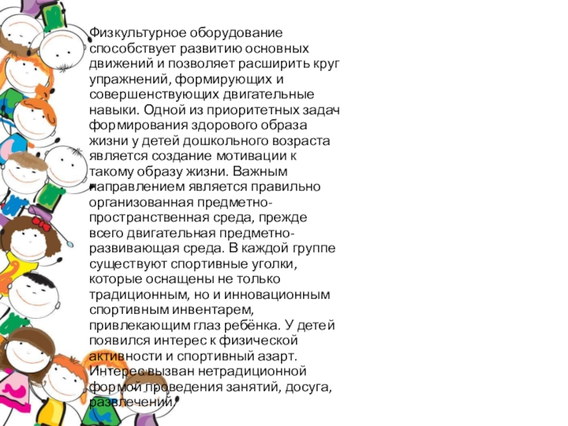 Слайд 12Физкультурное оборудование способствует развитию основных движений и позволяет расширить круг упражнений,