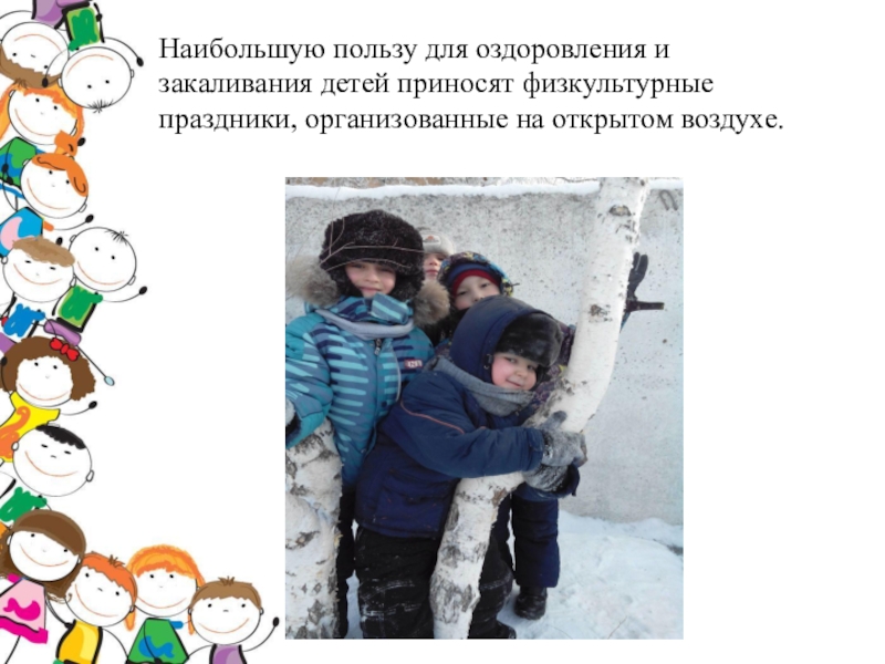Слайд 7Наибольшую пользу для оздоровления и закаливания детей приносят физкультурные праздники, организованные