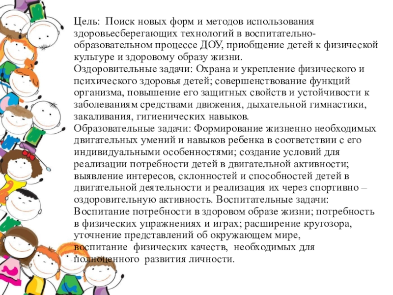 Оздоровительные задачи: Охрана и укрепление физического и психического здоровья детей; совершенствование функций организма, повышение его защитных свойств и устойчивости к заболеваниям средствами движения, дыхательной гимнастики, закаливания, гигиенических навыков.