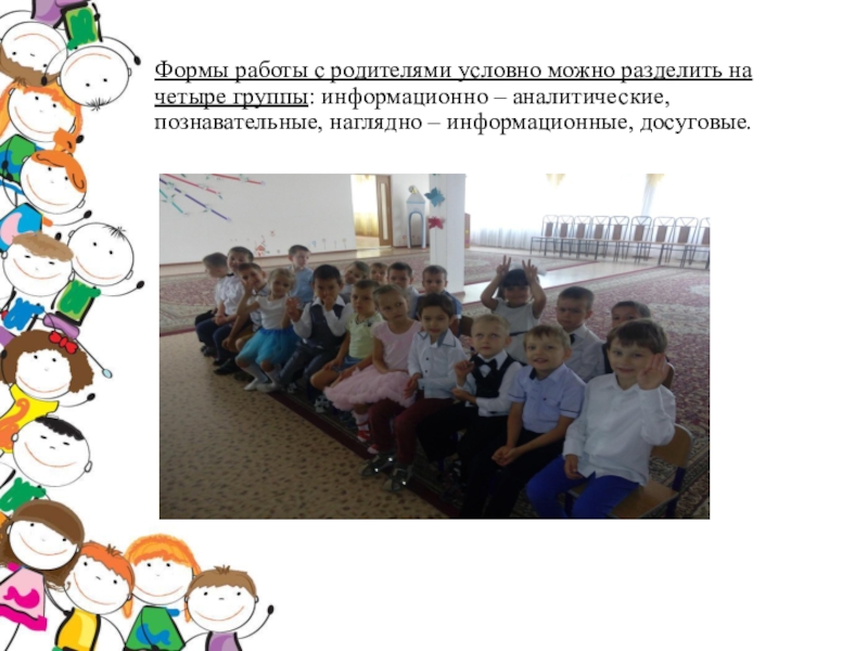 Слайд 9Формы работы с родителями условно можно разделить на четыре группы: информационно