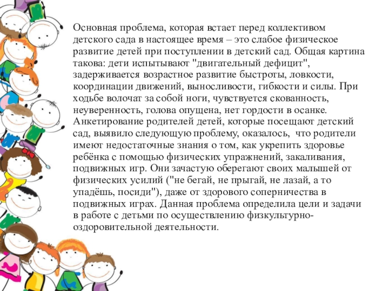 – это слабое физическое развитие детей при поступлении в детский сад. Общая картина такова: дети испытывают "двигательный дефицит", задерживается возрастное развитие быстроты, ловкости, координации движений, выносливости, гибкости и силы. При ходьбе волочат за собой ноги, чувствуется скованность, неуверенность, голова опущена, нет гордости в осанке. Анкетирование родителей детей, которые посещают детский сад, выявило следующую проблему, оказалось, что родители имеют недостаточные знания о том, как укрепить здоровье ребёнка с помощью физических упражнений, закаливания, подвижных игр. Они зачастую оберегают своих малышей от физических усилий ("не бегай, не прыгай, не лазай, а то упадёшь, посиди"), даже от здорового соперничества в подвижных играх. Данная проблема определила цели и задачи в работе с детьми по осуществлению физкультурно-оздоровительной деятельности.