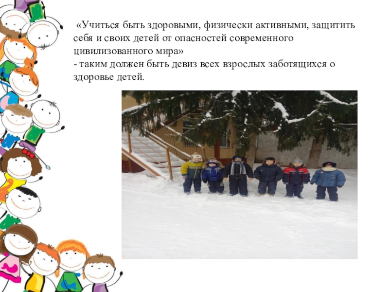 Слайд 2 «Учиться быть здоровыми, физически активными, защитить себя и своих детей