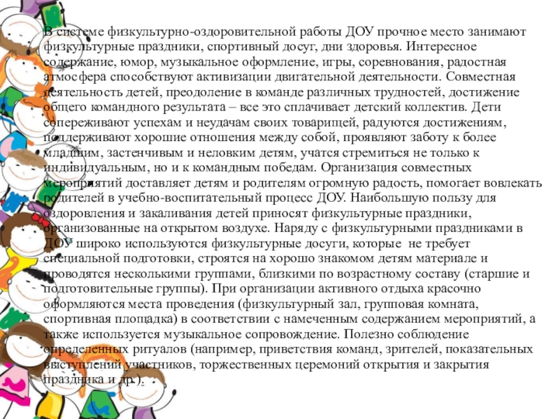 досуг, дни здоровья. Интересное содержание, юмор, музыкальное оформление, игры, соревнования, радостная атмосфера способствуют активизации двигательной деятельности. Совместная деятельность детей, преодоление в команде различных трудностей, достижение общего командного результата – все это сплачивает детский коллектив. Дети сопереживают успехам и неудачам своих товарищей, радуются достижениям, поддерживают хорошие отношения между собой, проявляют заботу к более младшим, застенчивым и неловким детям, учатся стремиться не только к индивидуальным, но и к командным победам. Организация совместных мероприятий доставляет детям и родителям огромную радость, помогает вовлекать родителей в учебно-воспитательный процесс ДОУ. Наибольшую пользу для оздоровления и закаливания детей приносят физкультурные праздники, организованные на открытом воздухе. Наряду с физкультурными праздниками в ДОУ широко используются физкультурные досуги, которые не требует специальной подготовки, строятся на хорошо знакомом детям материале и проводятся несколькими группами, близкими по возрастному составу (старшие и подготовительные группы). При организации активного отдыха красочно оформляются места проведения (физкультурный зал, групповая комната, спортивная площадка) в соответствии с намеченным содержанием мероприятий, а также используется музыкальное сопровождение. Полезно соблюдение определенных ритуалов (например, приветствия команд, зрителей, показательных выступлений участников, торжественных церемоний открытия и закрытия праздника и др.).