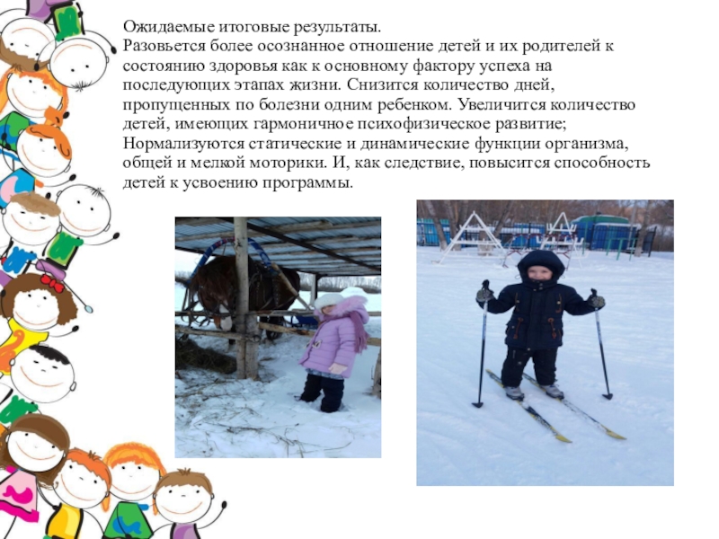 состоянию здоровья как к основному фактору успеха на последующих этапах жизни. Снизится количество дней, пропущенных по болезни одним ребенком. Увеличится количество детей, имеющих гармоничное психофизическое развитие; Нормализуются статические и динамические функции организма, общей и мелкой моторики. И, как следствие, повысится способность детей к усвоению программы.