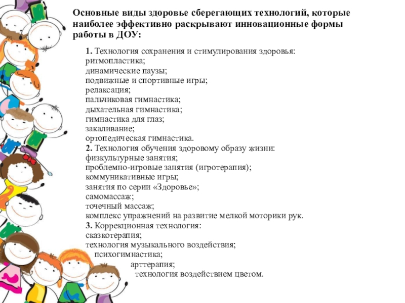 Слайд 11Основные виды здоровье сберегающих технологий, которые наиболее эффективно раскрывают инновационные формы