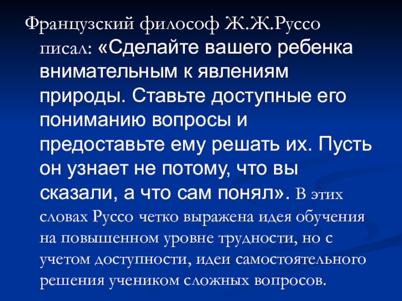 Ставьте доступные его пониманию вопросы и предоставьте ему решать их. Пусть он узнает не потому, что вы сказали, а что сам понял». В этих словах Руссо четко выражена идея обучения на повышенном уровне трудности, но с учетом доступности, идеи самостоятельного решения учеником сложных вопросов.