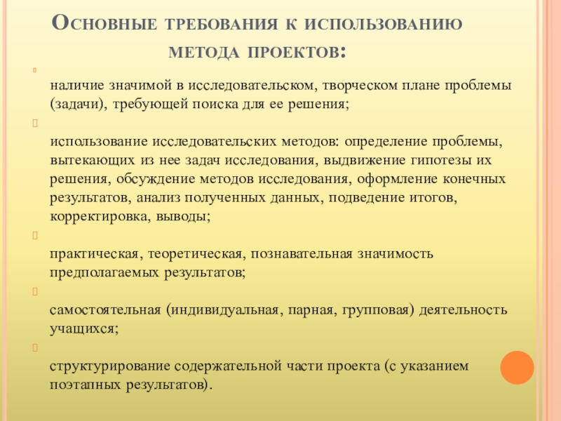 Слайд 3Основные требования к использованию метода проектов: