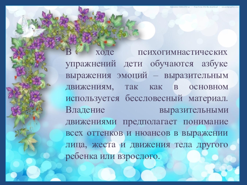 В ходе психогимнастических упражнений дети обучаются азбуке выражения эмоций – выразительным движениям, так как в основном используется бессловесный материал. Владение выразительными движениями предполагает понимание всех оттенков и нюансов в выражении лица, жеста и движения тела другого ребенка или взрослого.
