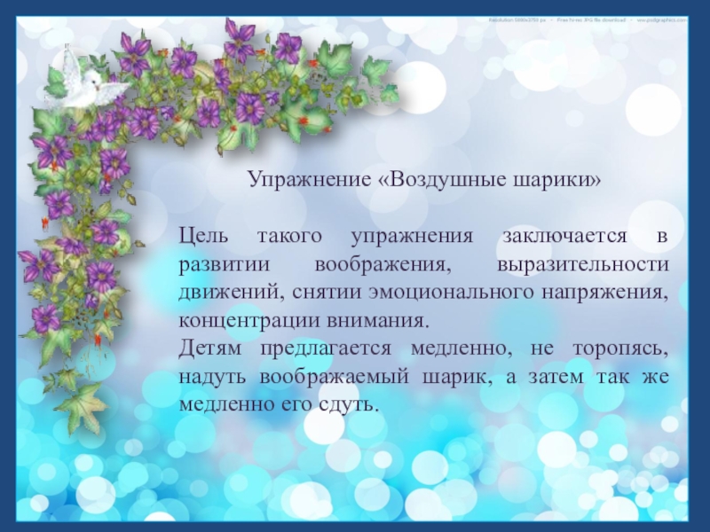 Детям предлагается медленно, не торопясь, надуть воображаемый шарик, а затем так же медленно его сдуть.