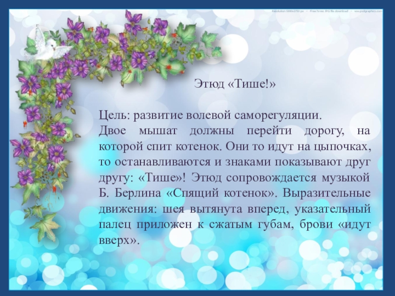 спит котенок. Они то идут на цыпочках, то останавливаются и знаками показывают друг другу: «Тише»! Этюд сопровождается музыкой Б. Берлина «Спящий котенок». Выразительные движения: шея вытянута вперед, указательный палец приложен к сжатым губам, брови «идут вверх».