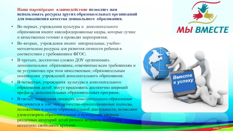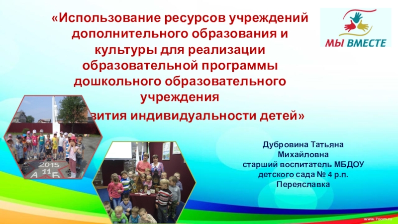 В связи с этим мы стараемся у себя в дошкольной организации апробировать реализацию основной образовательной программы дошкольного образования с использованием ресурсов детского сада и ресурсов организаций - партнеров.