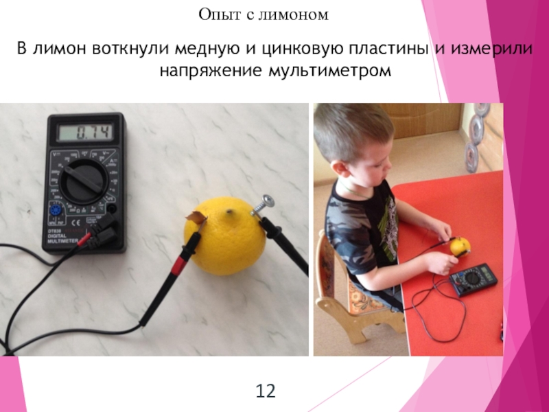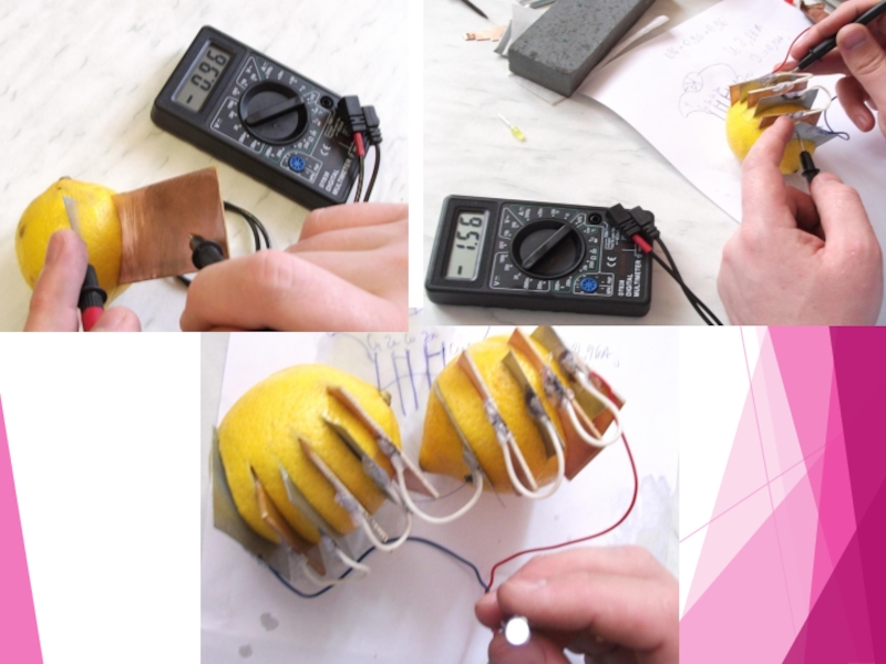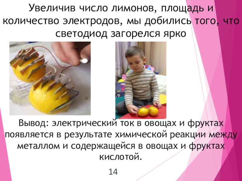 Вывод: электрический ток в овощах и фруктах появляется в результате химической реакции между металлом и содержащейся в овощах и фруктах кислотой.