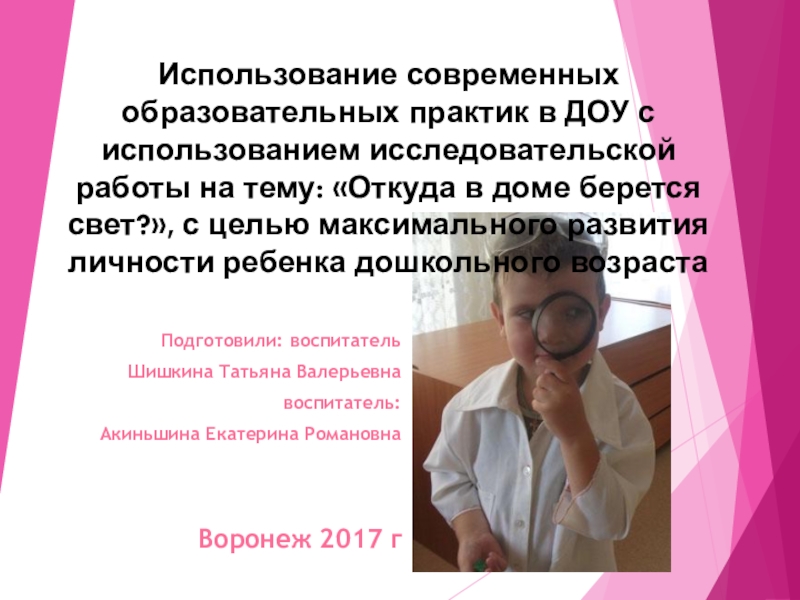практик в ДОУ с использованием исследовательской работы на тему: «Откуда в доме берется свет?», с целью максимального развития личности ребенка дошкольного возраста