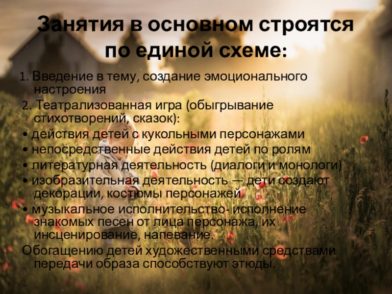 Обогащению детей художественными средствами передачи образа способствуют этюды.